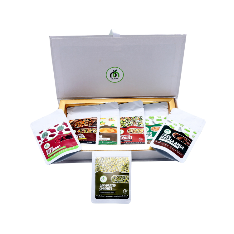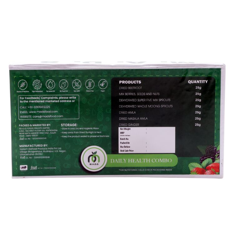 A curated mix of nutrient-rich snacks for everyday wellness. Includes dried beetroot, mix berries & nuts, super sprouts, moong sprouts, amla, masala amla, and dried ginger — all in convenient 25g portions. Perfect for healthy snacking and meal boosts!