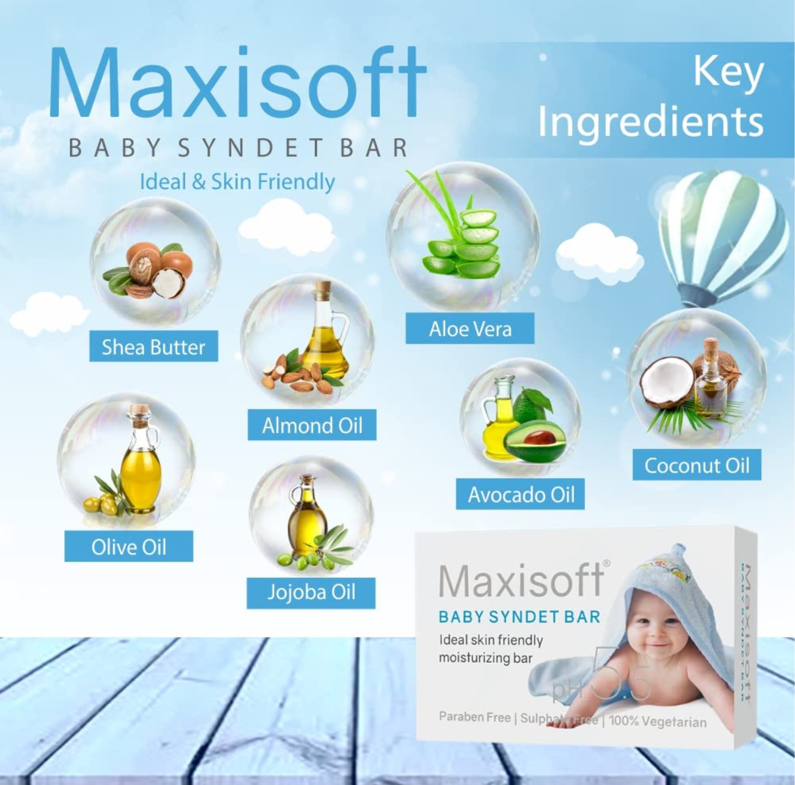 The Maxisoft Baby Syndet Bar is a soap-free, pH-balanced cleansing bar specially formulated for baby’s delicate skin. It gently cleanses without stripping natural oils, making it ideal for daily use from birth onward.