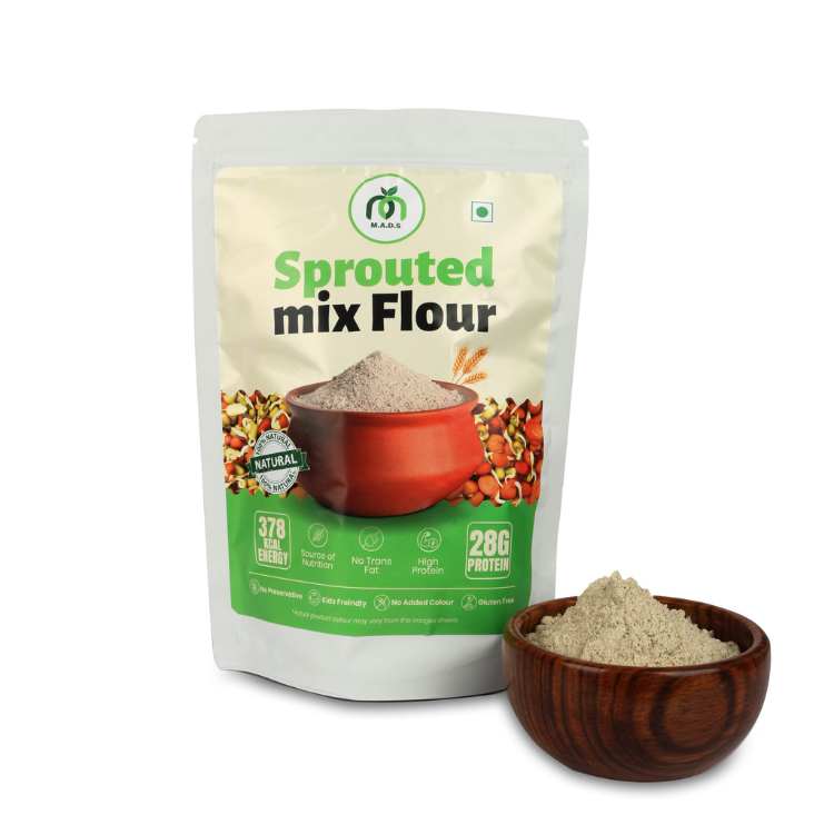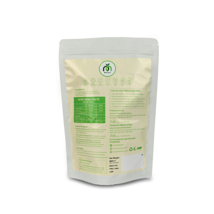 Sprouted Mix Flour (400g)Made from 5 sprouted grains — Moong, Moth, Soybean, Lobhia, and Chana — this nutrient-rich flour boosts digestibility and nutrient absorption. Perfect for healthy meals for all ages.