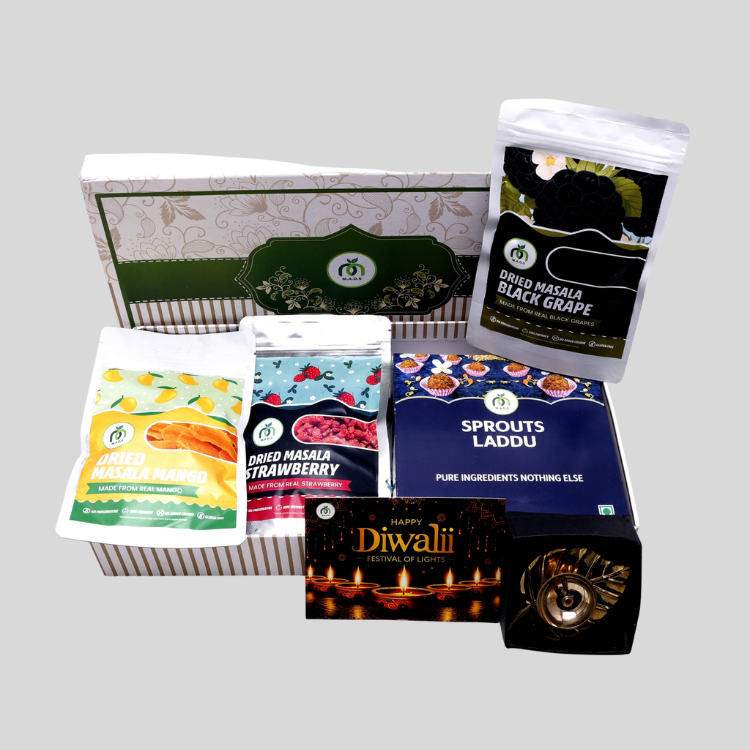 Celebrate Diwali with 9 nutritious sprouts laddos, masala-coated dried mango, strawberry, and black grape (100g each), a leaf-shaped diya, festive card, and premium gift box. Healthy, flavorful, and perfect for gifting.